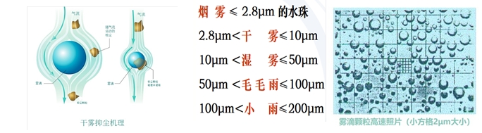根據(jù)“空氣動(dòng)力學(xué)原理”,含塵氣流繞過(guò)霧滴時(shí),塵粒由于慣性會(huì)從繞行的氣流中偏離而與霧滴相撞被捕捉,其被捕捉的機(jī)率與霧滴直徑有關(guān);水霧顆粒和粉塵碰撞,吸附,進(jìn)而聚結(jié)成團(tuán)時(shí),會(huì)受重力作用而沉降,從而起到抑塵作用;干霧抑塵裝置是由壓縮空氣驅(qū)動(dòng)聲波震蕩器,通過(guò)高頻聲波的音爆作用在噴頭共振室處將水高度霧化,產(chǎn)生10μm以下的微細(xì)水霧顆粒(簡(jiǎn)稱干霧)噴向起塵點(diǎn),抑制懸浮在空氣中的粉塵。