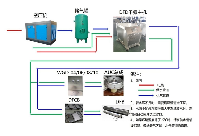 干霧抑塵裝置采用模塊化設(shè)計(jì)技術(shù)。由DFD系列干霧主機(jī)、螺桿式空氣壓縮機(jī)、AUC總成/DFB總成、水氣平衡裝置/水氣控制裝置、水氣連接管線、電伴熱系統(tǒng)和自動(dòng)控制系統(tǒng)組成。